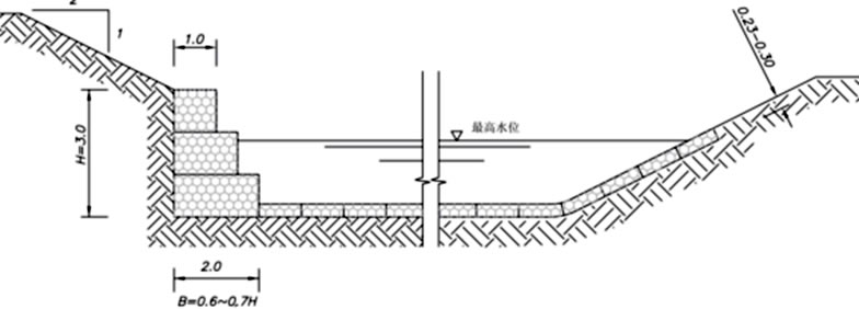 護(hù)坡結(jié)構(gòu)包括枯水位以下部位的護(hù)腳和枯水位以上部位的護(hù)坡兩部分。網(wǎng)墊厚度根據(jù)水流速度確定,以達(dá)到最優(yōu)安全性和經(jīng)濟(jì)性,一般采用厚度為0.17m-0.3m的網(wǎng)墊。坡比一般1:1.5-3,可根據(jù)土的內(nèi)摩擦系數(shù)和土與網(wǎng)墊的摩擦系數(shù)確定。